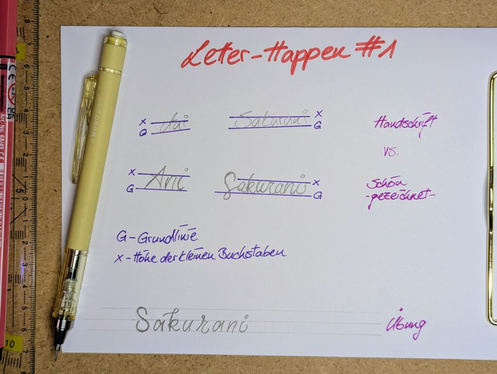 Danach werden die Grundlinie und die x-Höhe erklärt und verwendet, was auch deutlich macht, wie schnell man doch schief wird. 😅 Dann kann man noch ein wenig üben und vergleichen, und schon ist der erste Letter-Happen und das erste spannende Learning erledigt. 🤓