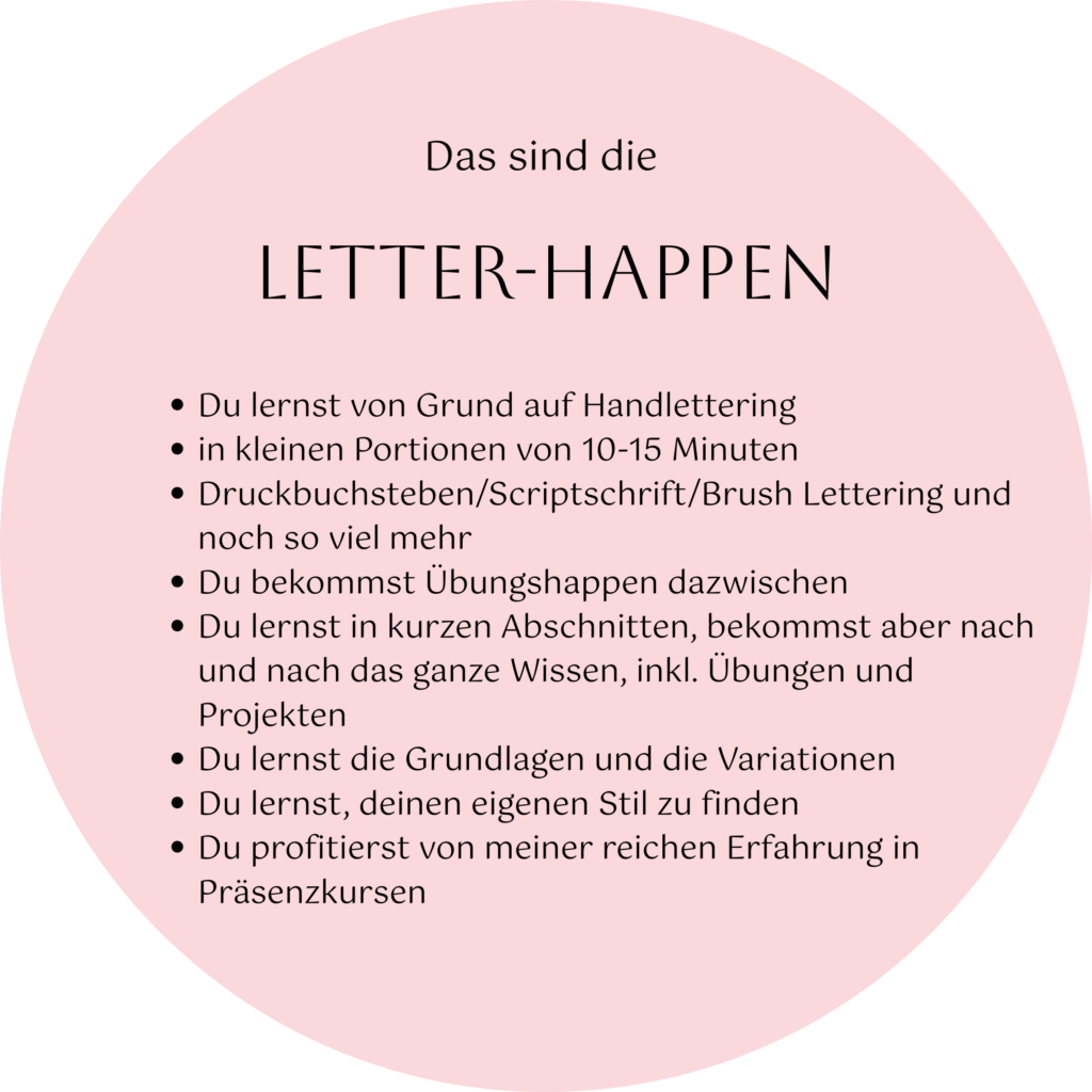 Denn bei ihren Letter-Happen handelt es sich um kurze und prägnante Videoanleitungen, zum Erlernen des geliebten Handletterings. ✍️ Jeder Happen umfasst 10-15 Minuten an Anleitungen und Erklärungen, natürlich gibt es auch jede Menge Übungen zum Vertiefen des Gelernten. Die Happen sind einzeln erwerbbar oder auch im Bundle von jeweils 5 Happen. In Summe werden es voraussichtlich 50-60 Happen (??), diese ergeben dann zusammen einen kompletten Kurs. Alle Letter-Happen sind online verfügbar, sodass man diese überall und jederzeit abrufbar hat (natürlich mit einem entsprechenden technischen Endgerät (Handy, Tablet, Pc) und einem Internetzugang). 💻
