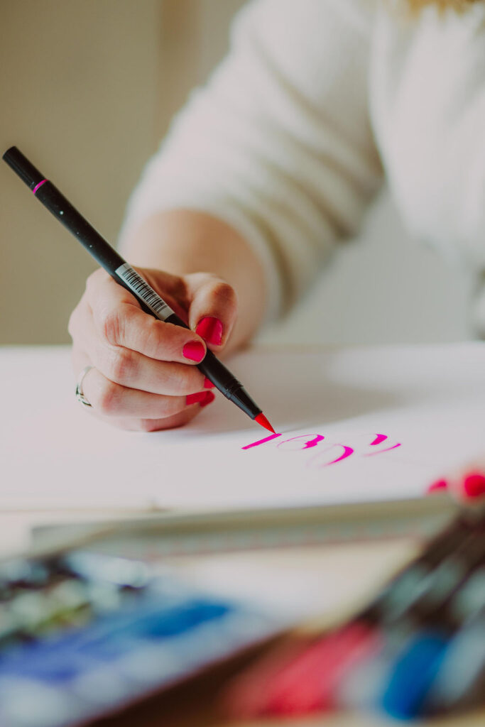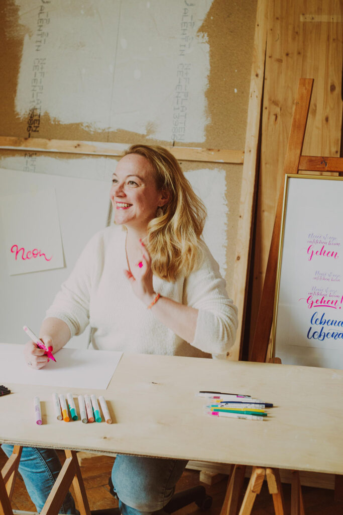 Ihre Liebe gilt den Buchstaben und Schriftstilen, ebenso erstellt sie individuelle Designs für Papeterie, personalisiert Weihnachtskugeln oder ist für Auftragsarbeiten buchbar. Natürlich beschriftet sie auch Schaufenster und Tafeln (ich liebe es auch sehr und möchte das ebenfalls mal können 😍), sie liebt es bei Live-Events zu lettern und veranstaltet leidenschaftlich gern Workshops und Kurse (Silke gibt auch Kurse bei Bösner und der VHS, bei ihr vor Ort). Auch andere kreative Kunst wie das malen mit Aquarell und Acryl, das Töpfern und Stempel schnitzen gehören zu ihren Leidenschaften. Um eben diese Leidenschaften, den Wunsch nach Kreativität und das Handwerk weiter geben zu können, hat Silke sogar das sogenannte Letter-Café ins Leben gerufen, welches alle zwei Wochen in Ulm im Café Davina stattfindet. ☕ Dazu später aber mehr.