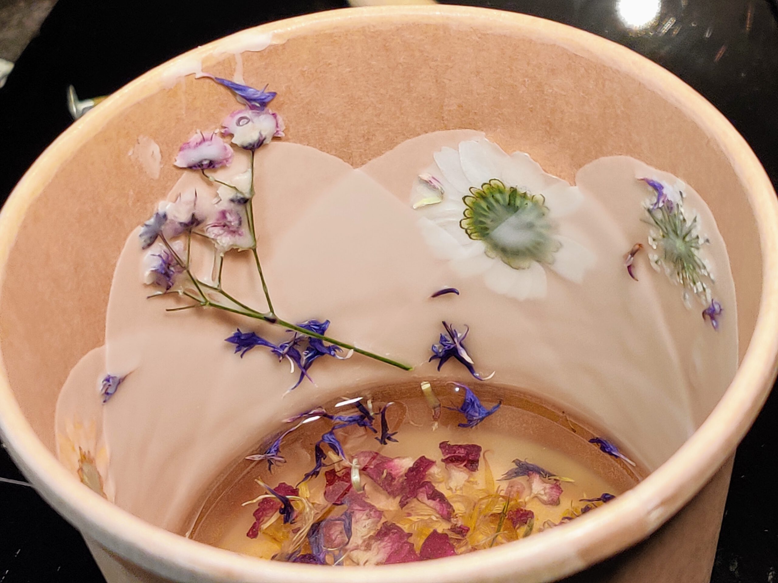 Ist das Wachs geschmolzen, kann man noch Kerzenfarbe hinzu geben, wenn man das möchte. Wir hatten ein knalliges gelb in unserer Box, welches wir natürlich auch verwendet haben. 💛 Die erste Hälfte ging direkt in die erste Kerze, die im Glas. Die Farbe hat sich ziemlich schnell aufgelöst, sodass wir zeitnah das Wachs ins Glas gießen konnten. Und dann wurde auch schon dekoriert. Die mitgelieferten Dekoblüten haben wir vorsichtig in das noch flüssige Wachs gleiten lassen und mit einem der Zahnstocher innen an den Rand des Glases gedrückt. 🏵️ Das wars schon. Die erste Kerze war so weit erst einmal fertig und konnte beiseite gestellt werden.